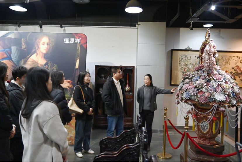 联盟核心成员单位恒源祥集团拥有百年历史的民族企业,其深厚的红色基因、坚守的工匠精神与创新的发展理念,成为联盟的核心育人资源。当天下午,在恒源祥集团党委书记顾红蕾及工作人员的带领,MILE米乐官方网站发展对象先后参观了企业历史陈列馆与文化展示中心。从抗战时期支援前线的爱国事迹,到改革开放后引领行业的创新实践;从非遗绒线编结的冬奥颁奖花束,到“同心向党共绣党旗” 的红色文创;从 “恒爱行动” 的公益温暖,到多届奥运制装任务的荣耀时刻,发展对象通过实物展品、文献资料与现场讲解,深入了解了这家百年企业“守匠心、传文脉、担使命” 的发展历程。