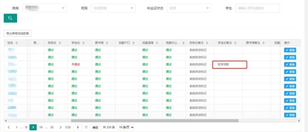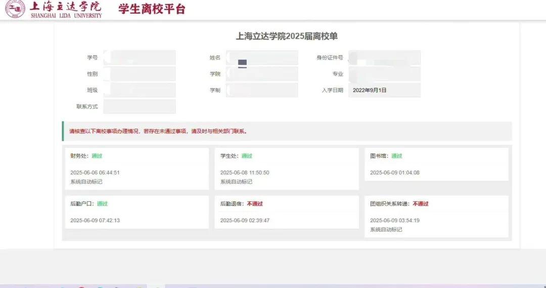 学生端可登录后查询本人离校办理现状,如有不通过可以直接查看到不通过的原因,如下图: